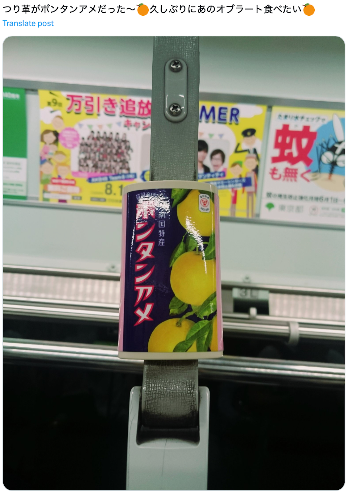 お菓子メーカーであるA社は、看板商品のデザインをそのまま東京都営線の吊革広告に採用しました。